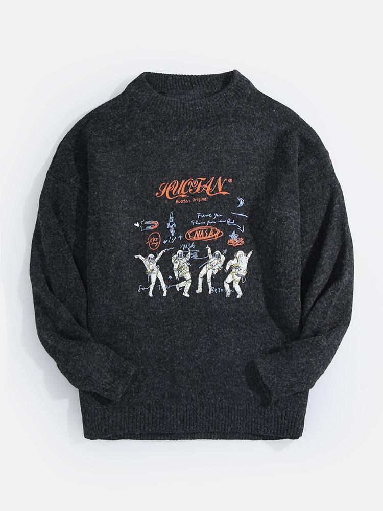 Astronaut Brevtrykk For Menn Med Rund Hals Strikkede Uformelle Pullover-Gensere