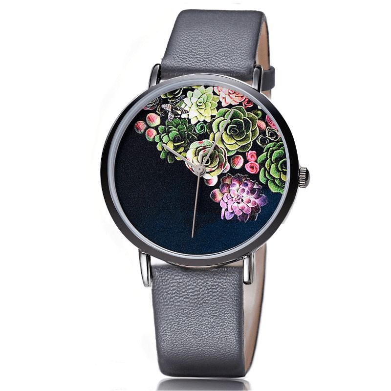 Baosaili 1011 Mote Kvinner Ultratynn Klokkekasse Blomstermønsterskive Lærreim Kvartsklokke