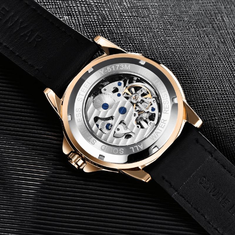 Benyar 5173 Fashion Sports To-Side Hollow Design Pu Leather Strap 3Atm Vanntett Herre Automatisk Mekanisk Klokke