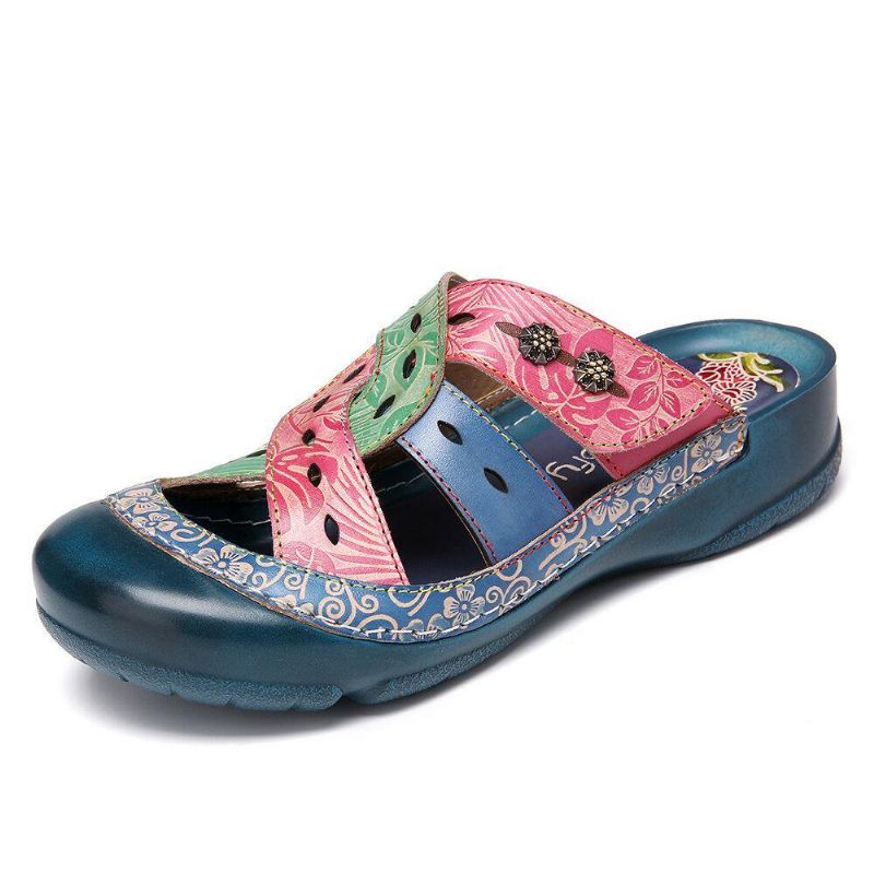Bohemia Cutout Pustende Color Block Backless Slip On Flat Sandaler