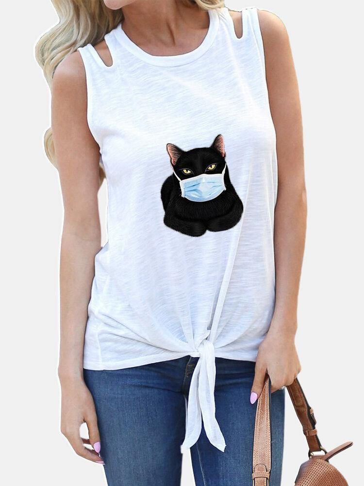 Cartoon Cat Trykt Ermeløse Kvinner Casual Tank Tops