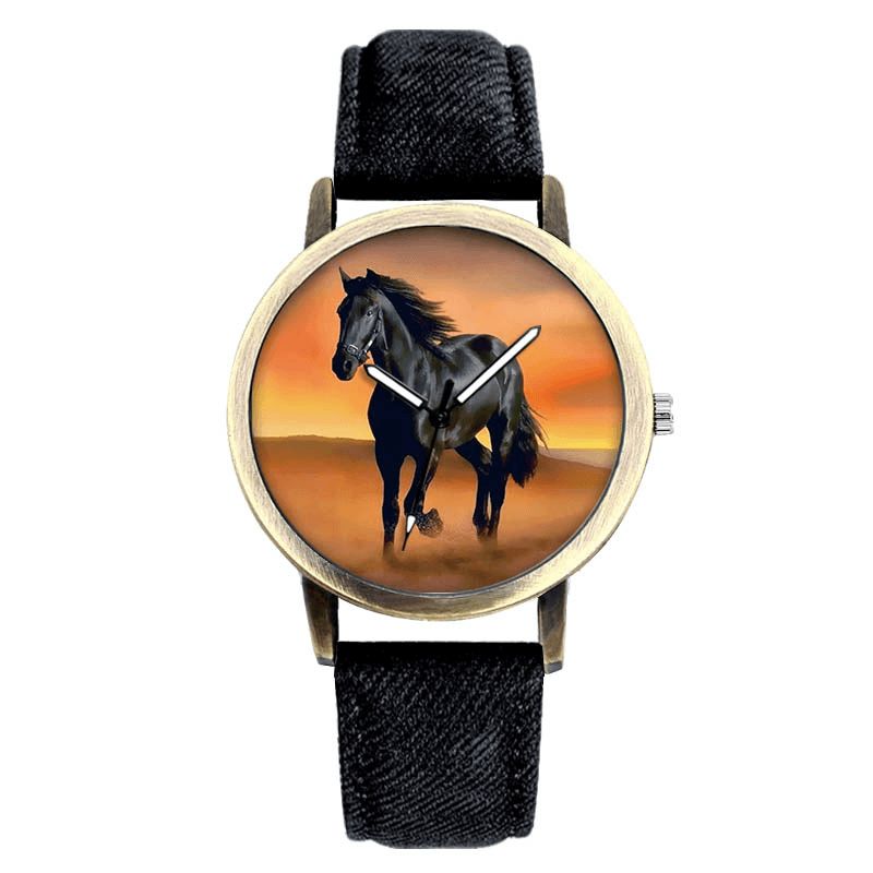 Casual Black Horse Desert Dial All-Match Denim Strap Herre Kvartsklokke Armbåndsur