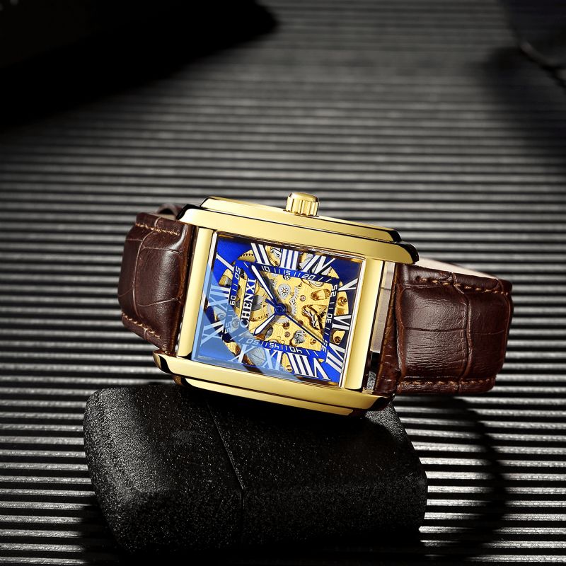 Chenxi Automatisk Mekanisk Klokke For Menn Firkantet 3D Uthulet Skive Lysende Pekerreim I Skinn Vanntett Armbåndsur