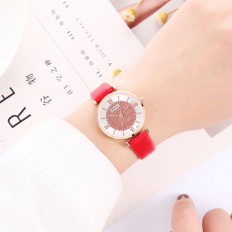 Deffrun Roman Number Crystal Elegant Design Dame Watch Leather Band Quartz Klokker