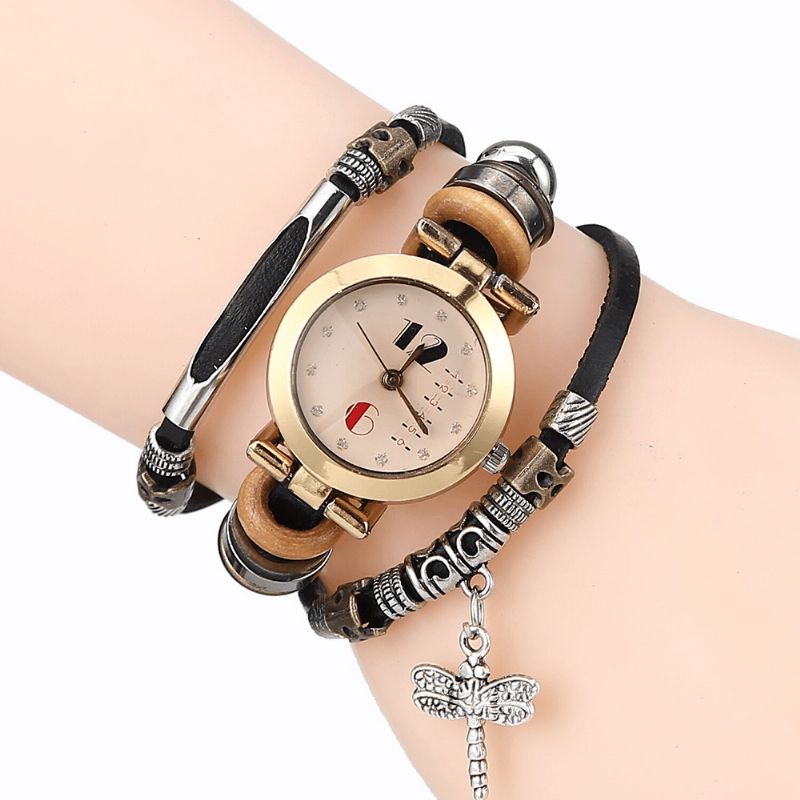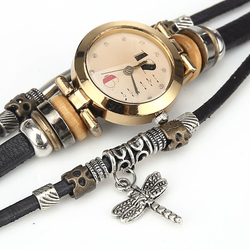 Deffrun Vintage Flerlags Kvinner Armbånd Watch Diamond Dragonfly Anheng Lær Band Kvarts Watch