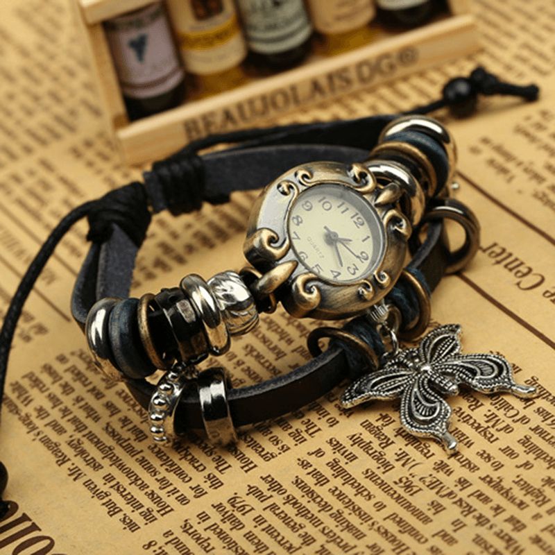 Deffrun Vintage Multilayer Cow Leather Dame Armbånd Watch Butterfly Pendant Kvartsklokke