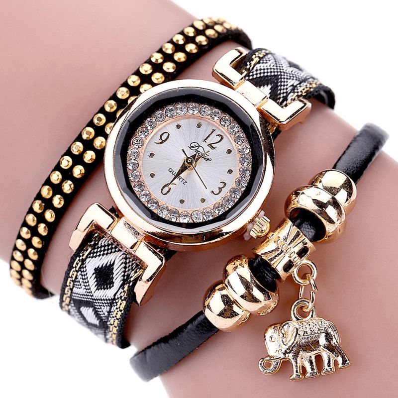 Duoya Xr1889 Fasjonable Gullelefantarmbåndsklokke For Kvinner Med Lærreim Kvartsklokker