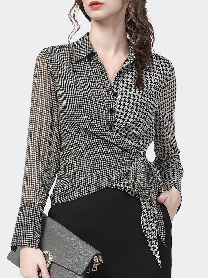 Elegant Houndstooth Langermet Skjorte Kragebluse
