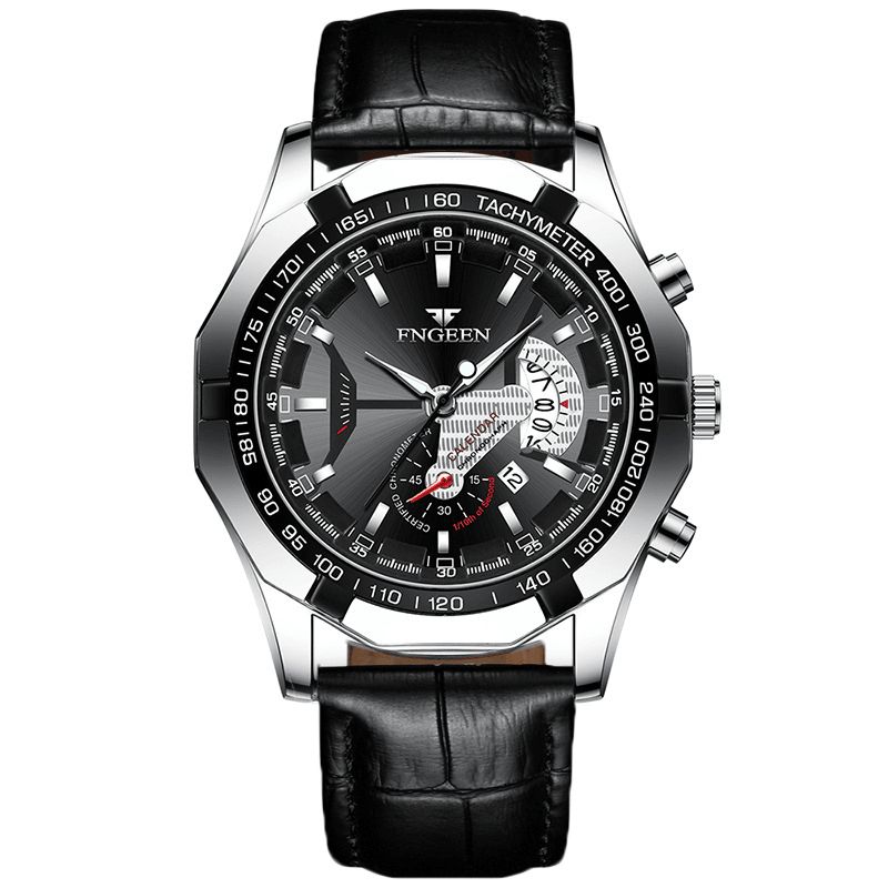 Fngeen S001 Fashion Business Luminous Pointer Med Kalenderdatovisning Stål / Pu-Skinnreim Vanntett Herrekvartsklokke