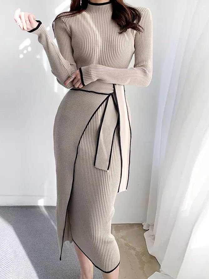 Høy Elastisitet Tight Color Block Langermet Kjoler