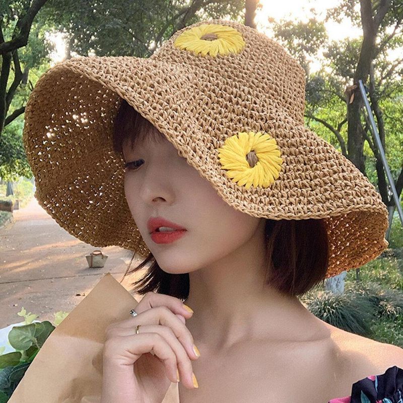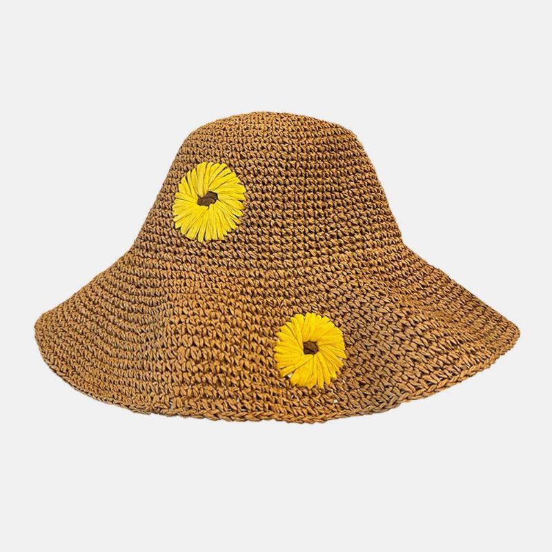 Kvinner Halm Blomster Ensfarge Elegant Solsikke Stor Brem Visir Solbeskyttelse Hat Beach Hat Bøtte Hat
