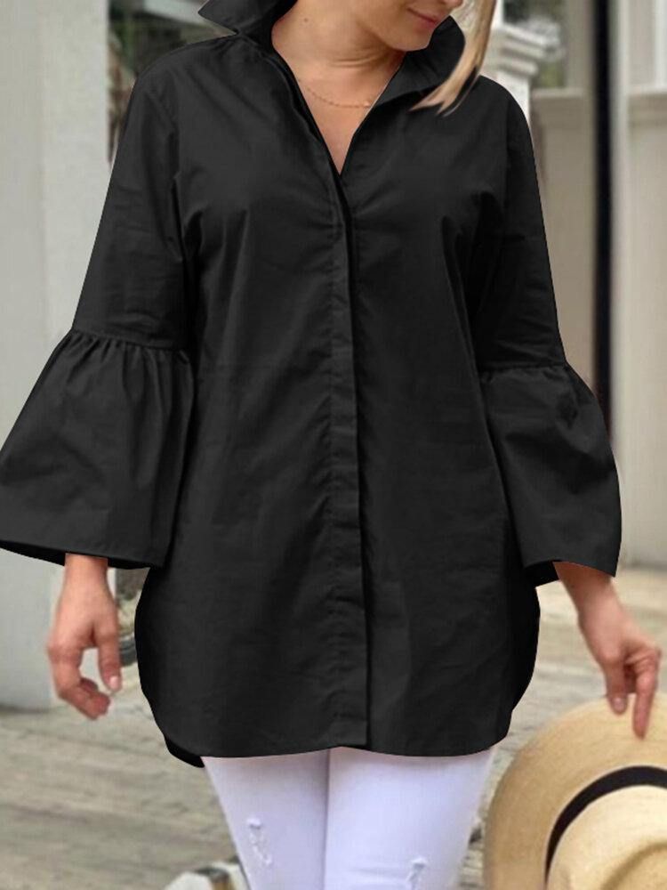 Kvinner Solid Skjult Knapp Lapel Side Split Flared Sleeve Casual Skjorter