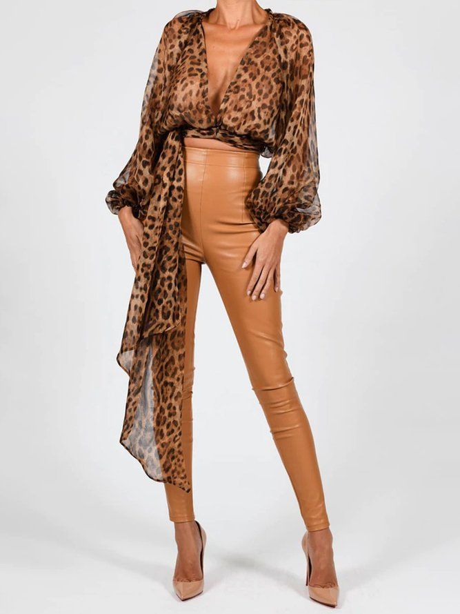 Langermet Passform Leopard Urban Chiffon Topp Med Høy Midje