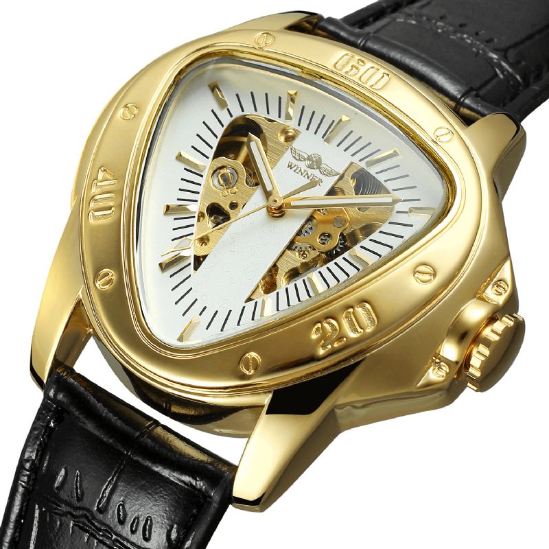 Luksus Vintage Menn Automatisk Klokke Hul Kunst Trekantet Skive Vanntett Lærreim Mekanisk Klokke