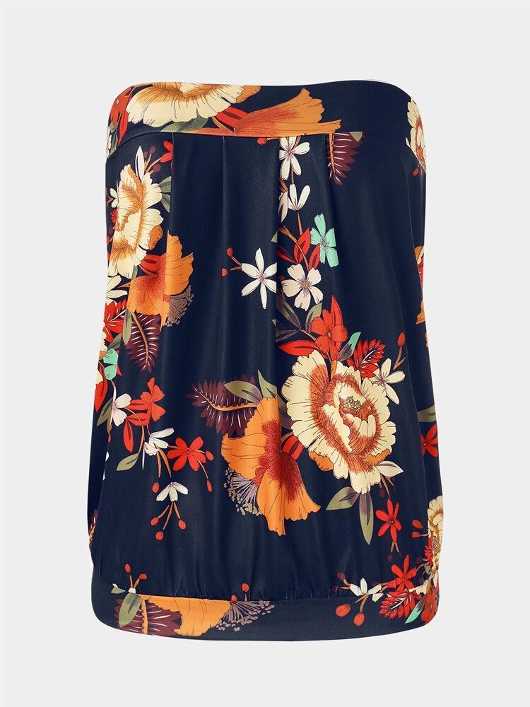 Marineblå Blomstertrykk Etnisk Stil Stroppeløs Ermeløs Tube Tank-Topp