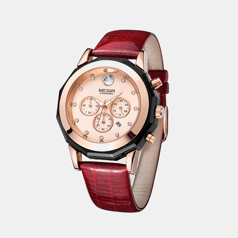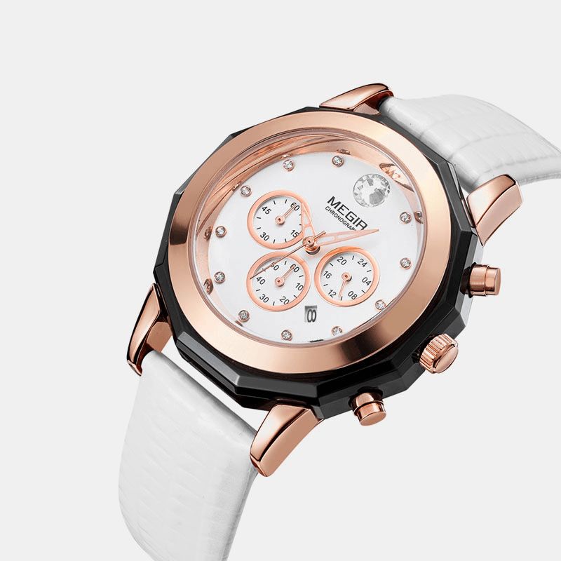 Megir 2042L Fashion Style Crystal Dial Dato Display Vanntett Lærreim Kvartsklokke For Kvinner