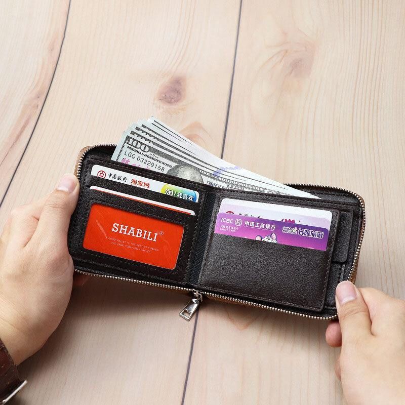 Menn Faux Leather Retro Classical Draw Card Slot Bifold Zipepr Kortholder Lommebok