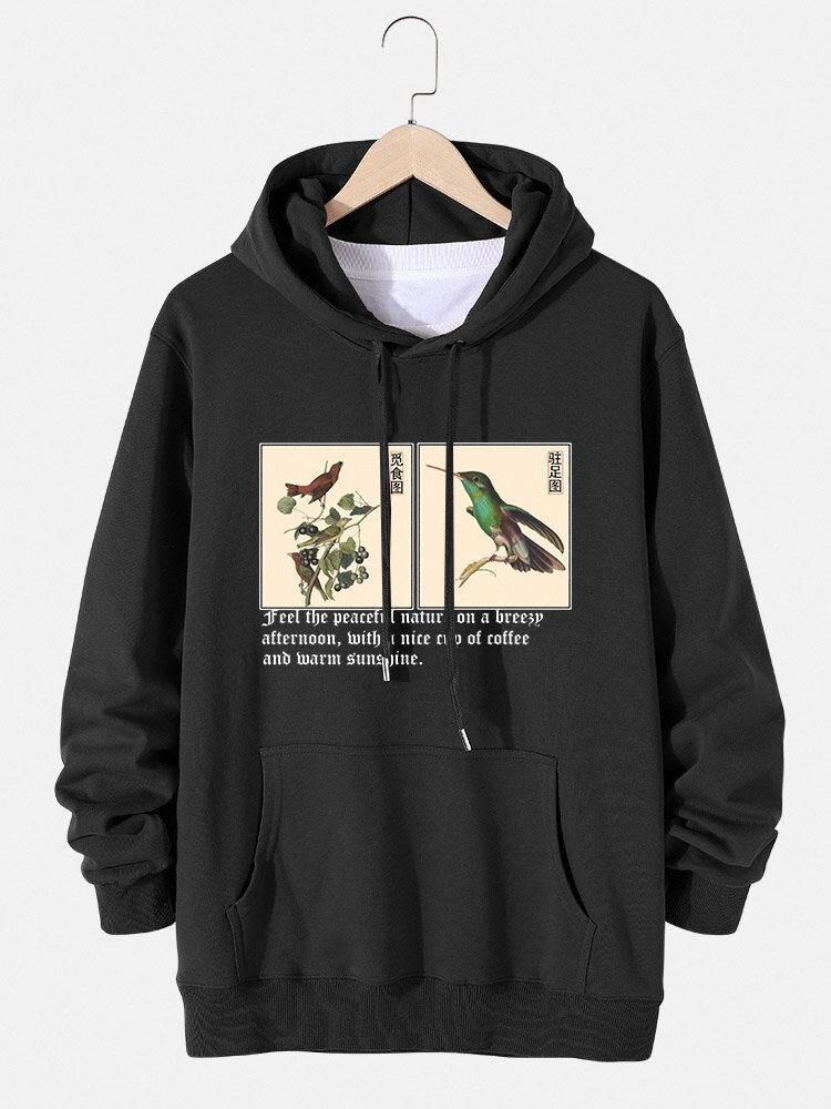 Menns Fugl Kinesisk Maleri Tekstutskrift Bomull Hettegensere Med Snøring