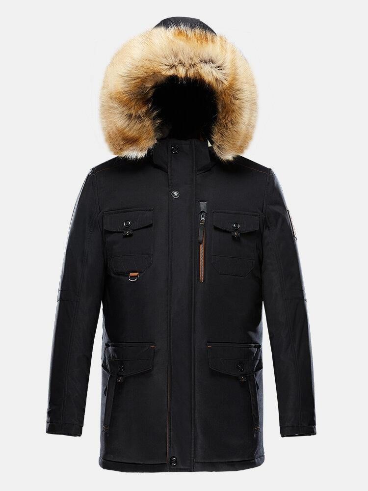 Menns Tykke Flerlomme Fuskepelskrage Hette Vindtette Varme Mellomlange Kåper