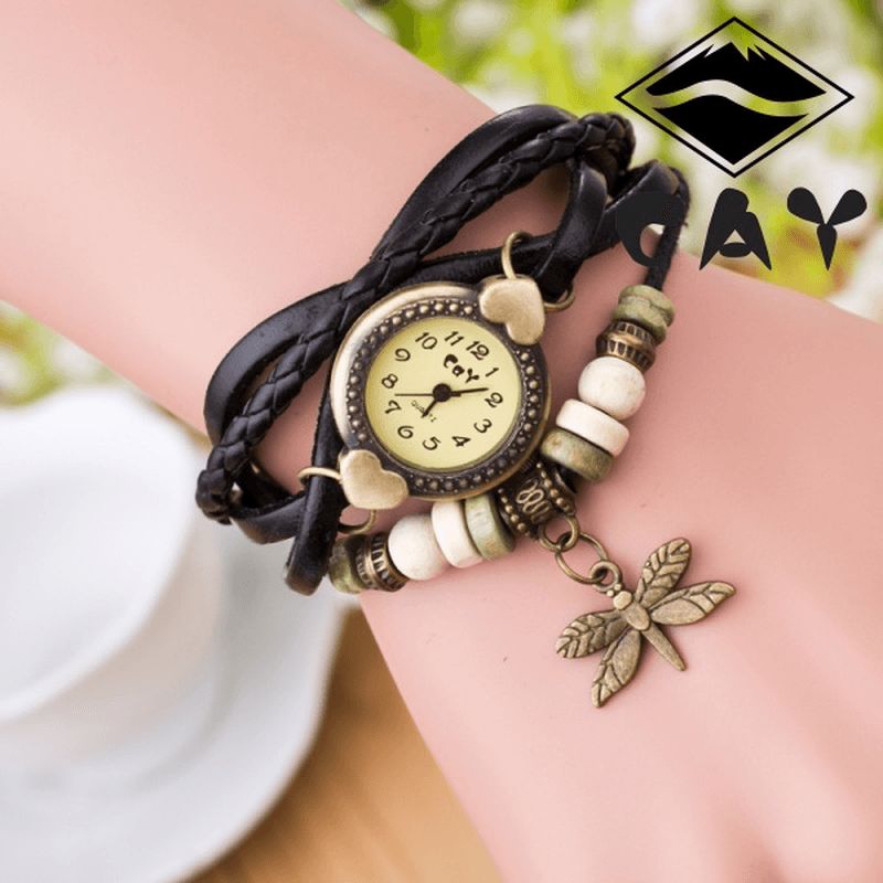 Mote Vintage Multi-Layer Dragonfly Pendant Beaded Armbånd Quartz Watch Armbåndsur