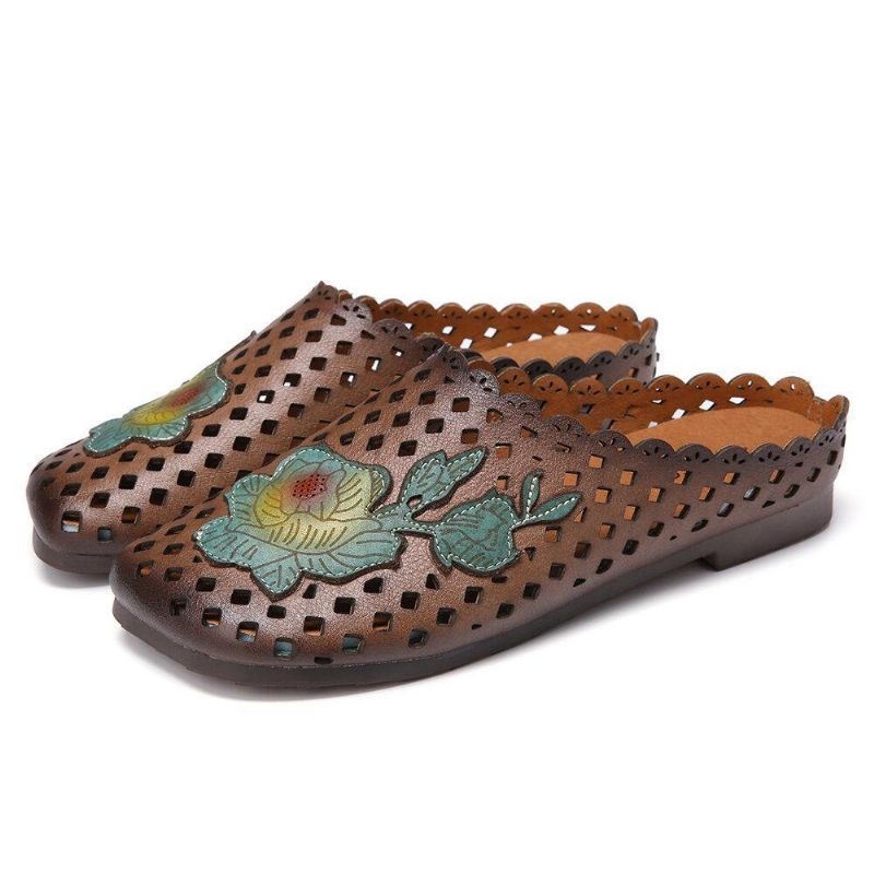 Retro Lær Blomsterapplikasjonsutskjæringer Myke Flate Muldyr Tresko Slip-On Sandaler