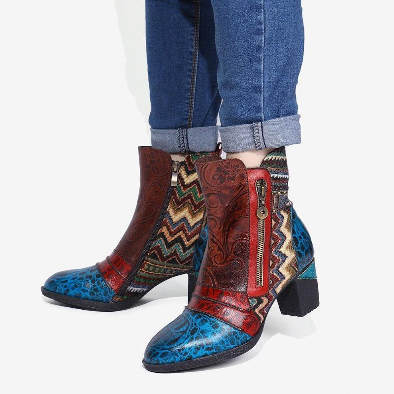 Retro Leather Embosed Flower Splicing Folkways Style Dobbel Side Glidelås Casual Boots