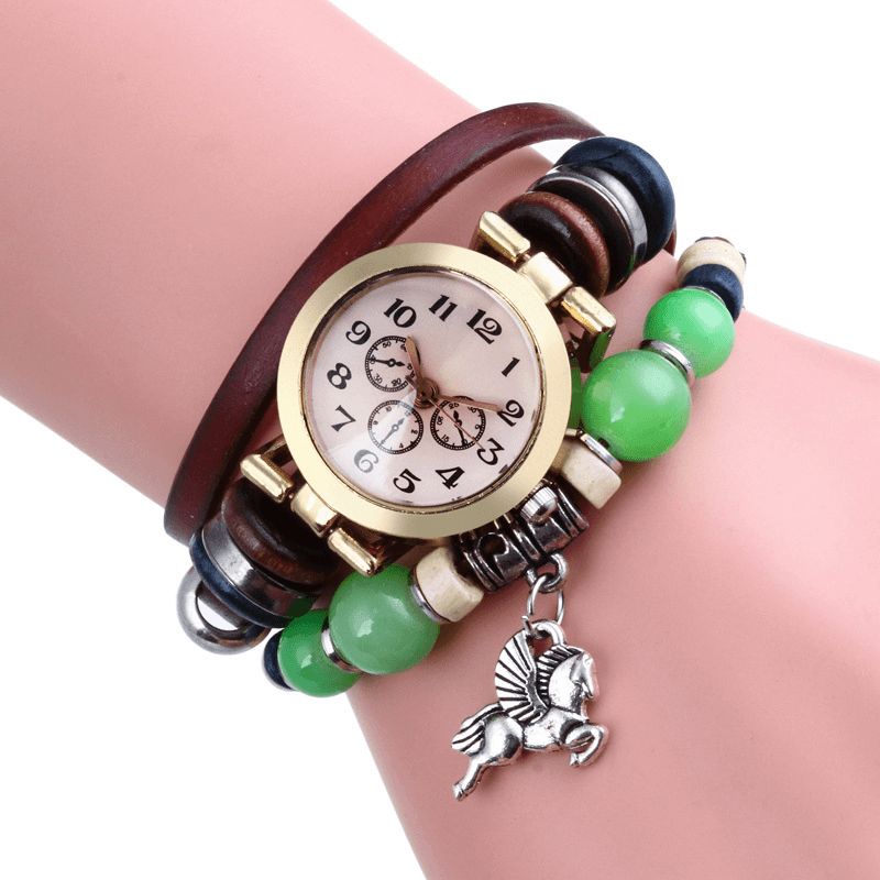 Retro Stil Vintage Kvarts Klokke Dekorert Peker Firkløver Anheng Perler Flerlags Armbånd Klokke