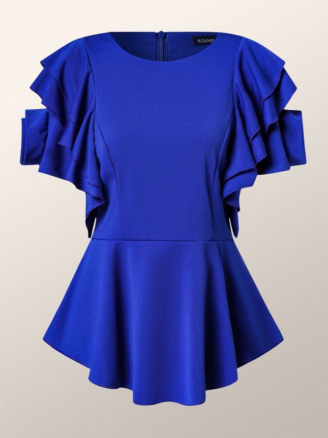 Solid Elegant Kortermet Crew Neck Flouncing Topp