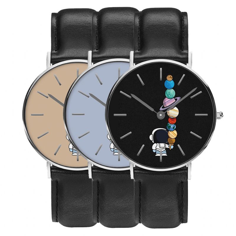 Uformell Stil Herreklokke Cartoon Astronaut Star Ice-Cream Print Pu Lærreim Klokke Kvartsklokker