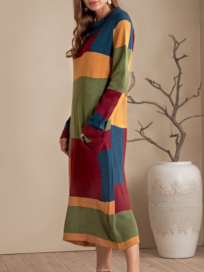 Yellow Shift Solid Pocket Color-Block Sweater Dress